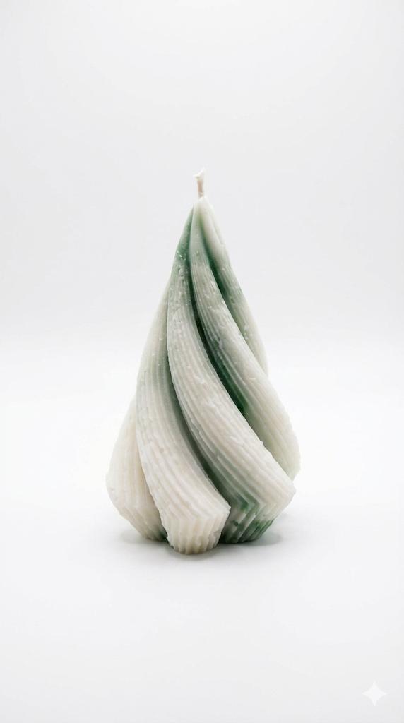 Twisted swirl tree candle in white and green, giving a modern, minimal take on the classic Christmas tree.