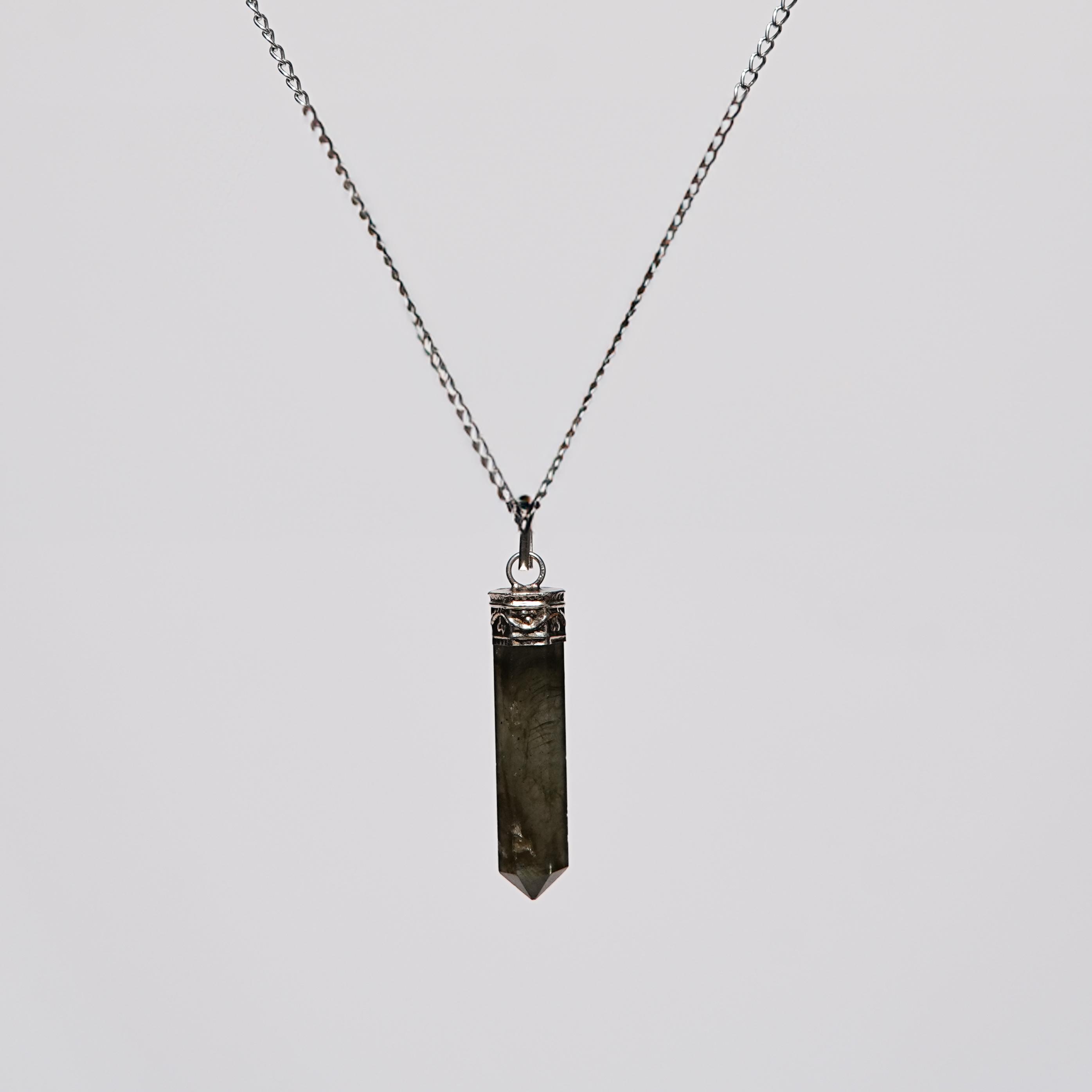 Labradorite pencil pendant directs energy for transformation, insight, and protection against negativity.