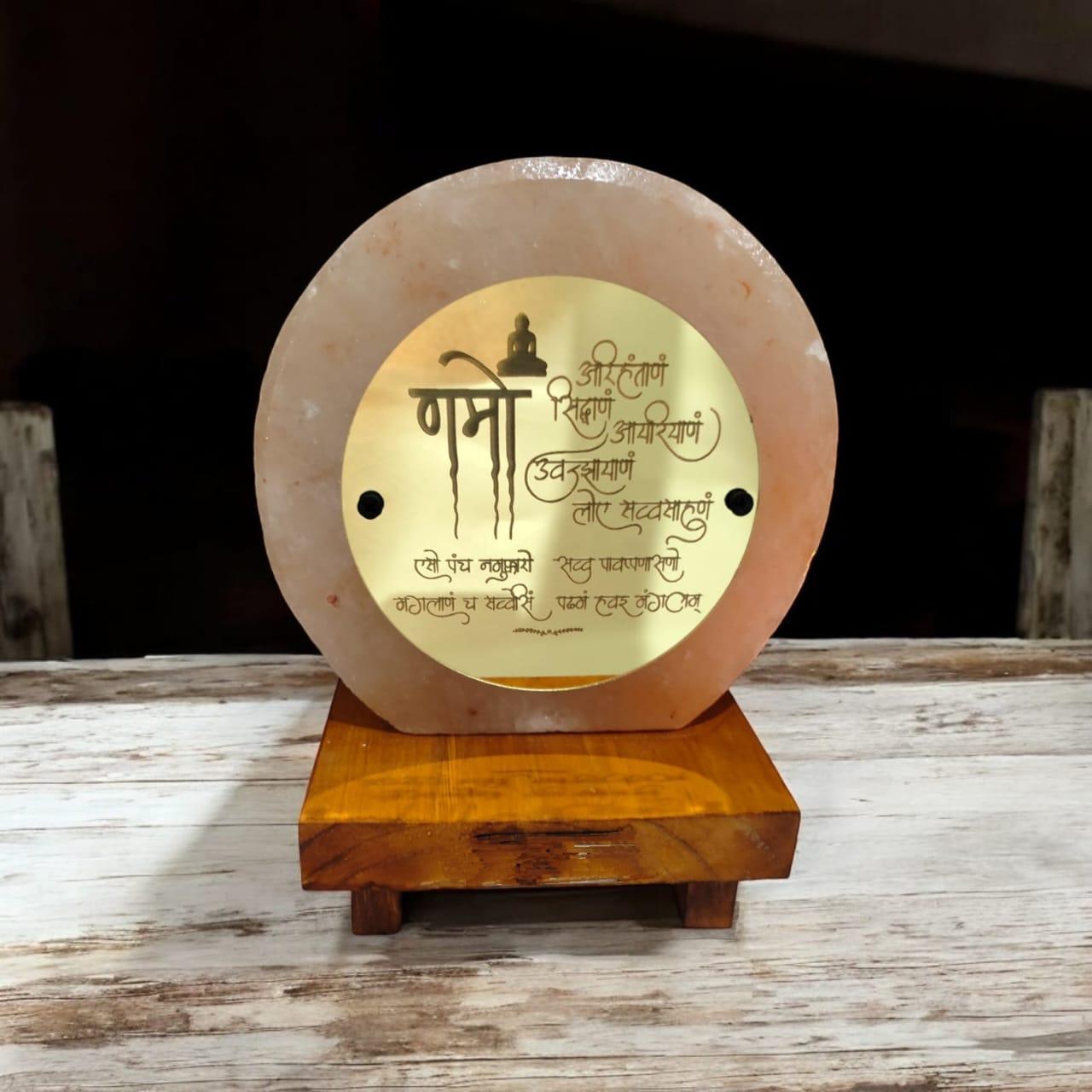 A devotional salt lamp inscribed with Navkar Mantra, symbolizing faith and divine protection.