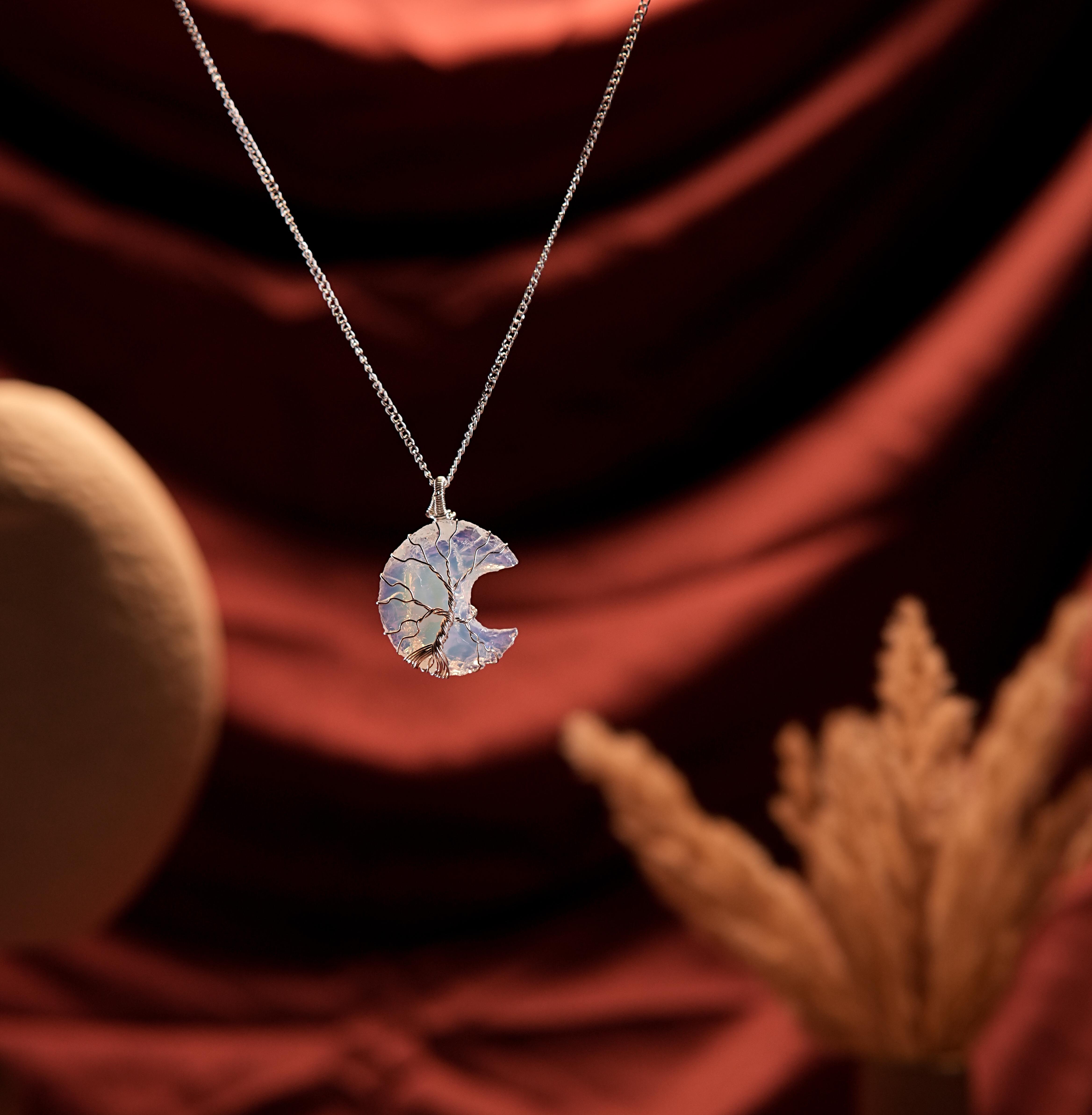 A glowing moon pendant wrapped in wire, amplifying energy flow, intuition, and emotional healing.